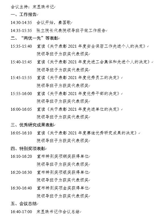 为总结2021年工作、表彰先进,部署2022年任务,定于2022年1月13日召开院2022年工作会议(安排附后)。现将有关事项通知如下: