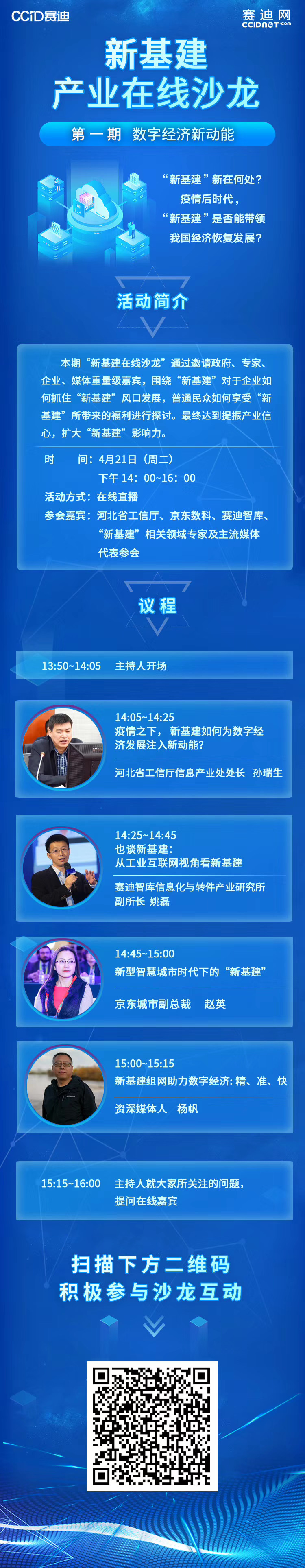 作为中国电子信息产业研究院对于“新基建”发展开展,面向大众的在线交流活动。《“新基建”产业在线沙龙》整体活动以“新基建·新发展·稳信心”为主题,围绕着“新基建”是否能带领我国经济恢复发展?“新基建”又有何新颖之处?等多个社会、产业关于“新基建”热点话题,通过邀请政府、专家、企业、媒体四方互动,围绕“新基建”对于企业(尤其是中、小企业)如何抓住“新基建”风口发展,普通民众如何享受“新基建”所带来的福利进行探讨。最终达到提振产业信心,扩大“新基建”影响力。