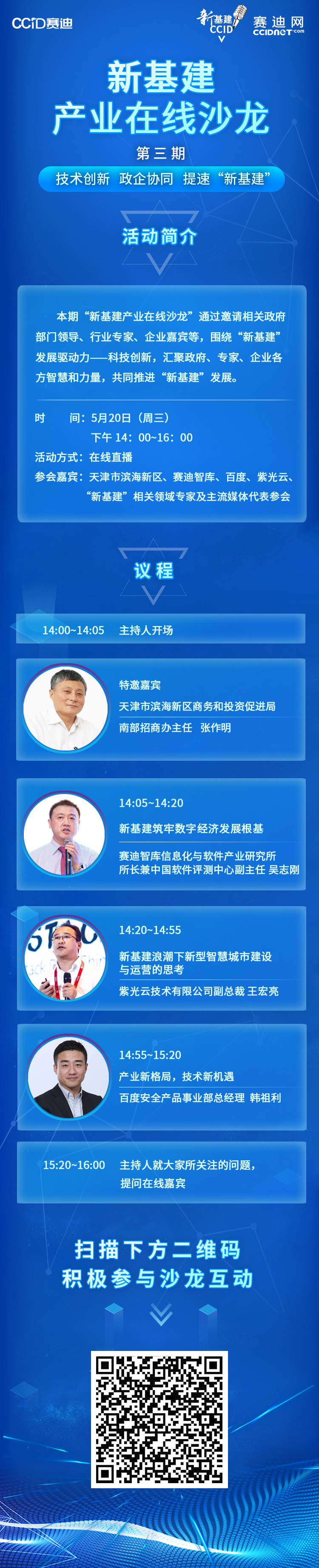 作为中国电子信息产业研究院对于“新基建”发展开展,面向大众的在线交流活动。《“新基建”产业在线沙龙》整体活动以“新基建·新发展·稳信心”为主题,围绕着“新基建”是否能带领我国经济恢复发展?“新基建”又有何新颖之处?等多个社会、产业关于“新基建”热点话题,通过邀请政府、专家、企业、媒体四方互动,围绕“新基建”对于企业(尤其是中、小企业)如何抓住“新基建”风口发展,普通民众如何享受“新基建”所带来的福利进行探讨。最终达到提振产业信心,扩大“新基建”影响力。