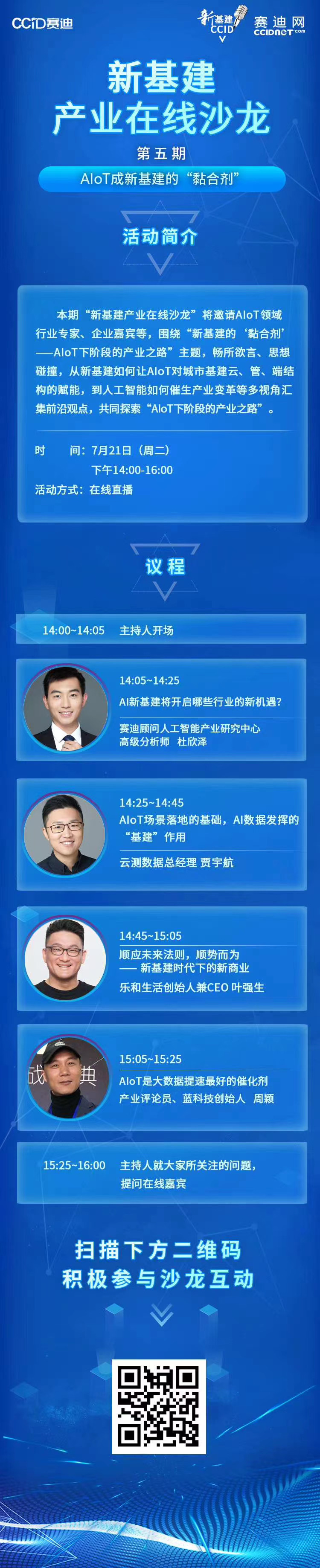 7月21日下午,在中国电子信息产业发展研究院指导下,由赛迪网、《数字经济》杂志、赛迪融媒体主办,赛迪顾问和赛迪智库的大力支持下,“新基建”产业在线沙龙第五期以“在线直播”的形式正式开始。本期沙龙历时近2个小时,专家、企业、媒体、网友四方互动,各抒己见,在线观看人数达18万余人,嘉宾金句频出,引爆直播间。本次沙龙以“AIoT成新基建的‘黏合剂'”为主题,与会嘉宾畅所欲言,共同讨论在后疫情时代,数字经济逆势增长,政府、企业、市场在“新基建”下如何发展。赛迪顾问人工智能产业研究中心高级分析师杜欣泽、云测数据总经理贾宇航、乐和生活创始人兼CEO叶强生和产业评论员、蓝科技创始人周颖发表了主题演讲,并在线回答媒体和网友提问。